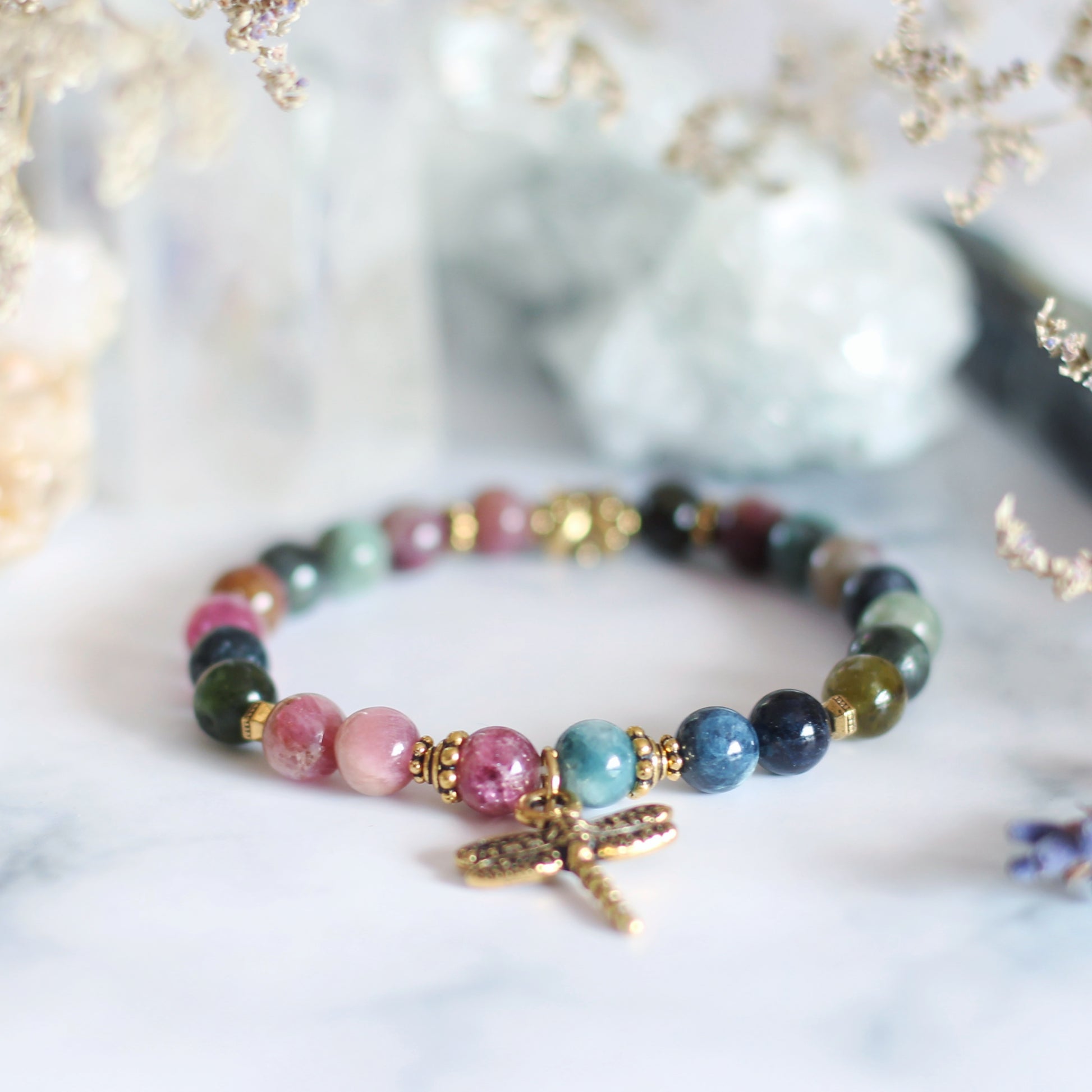 with gold-plated pewter dragonfly charm and embellishments