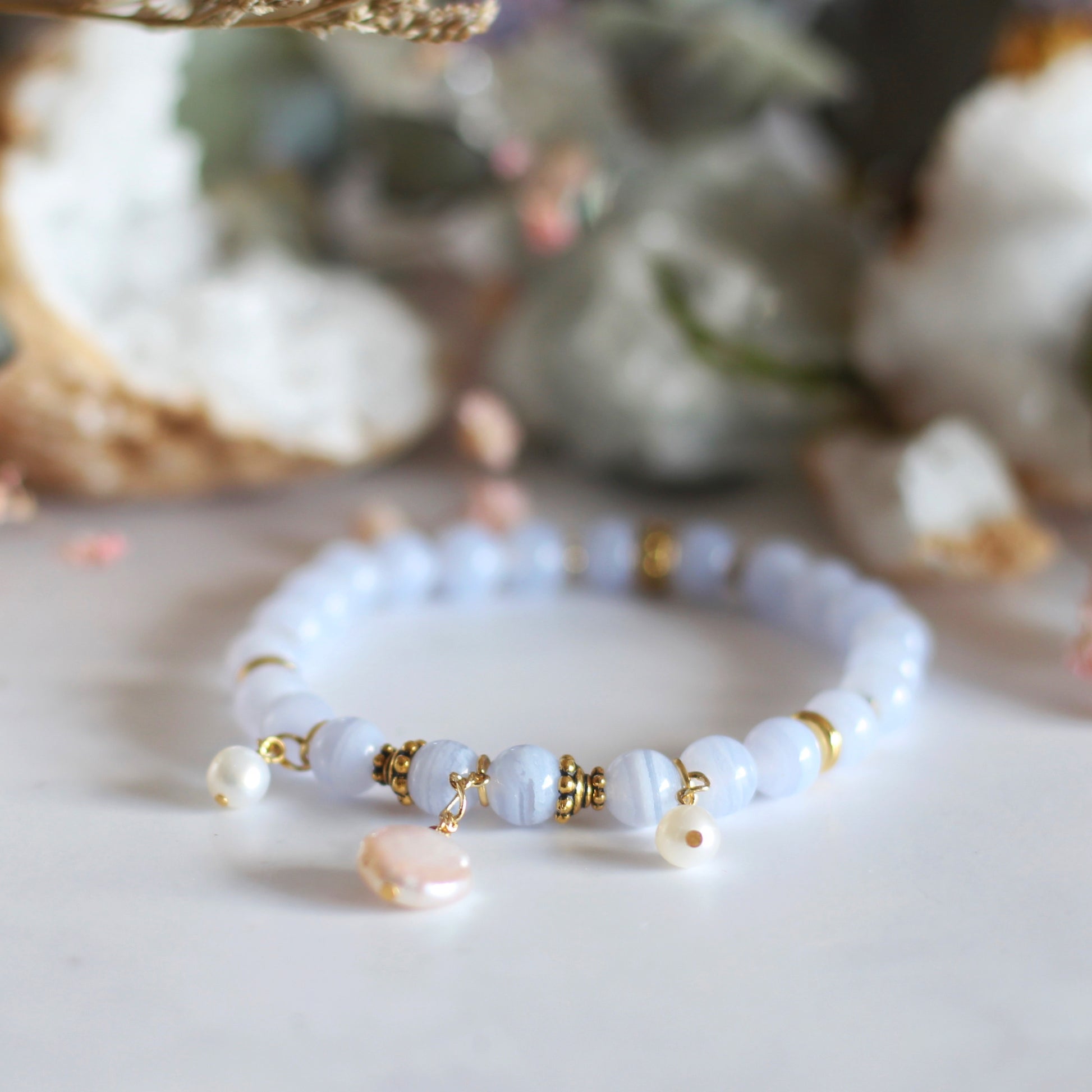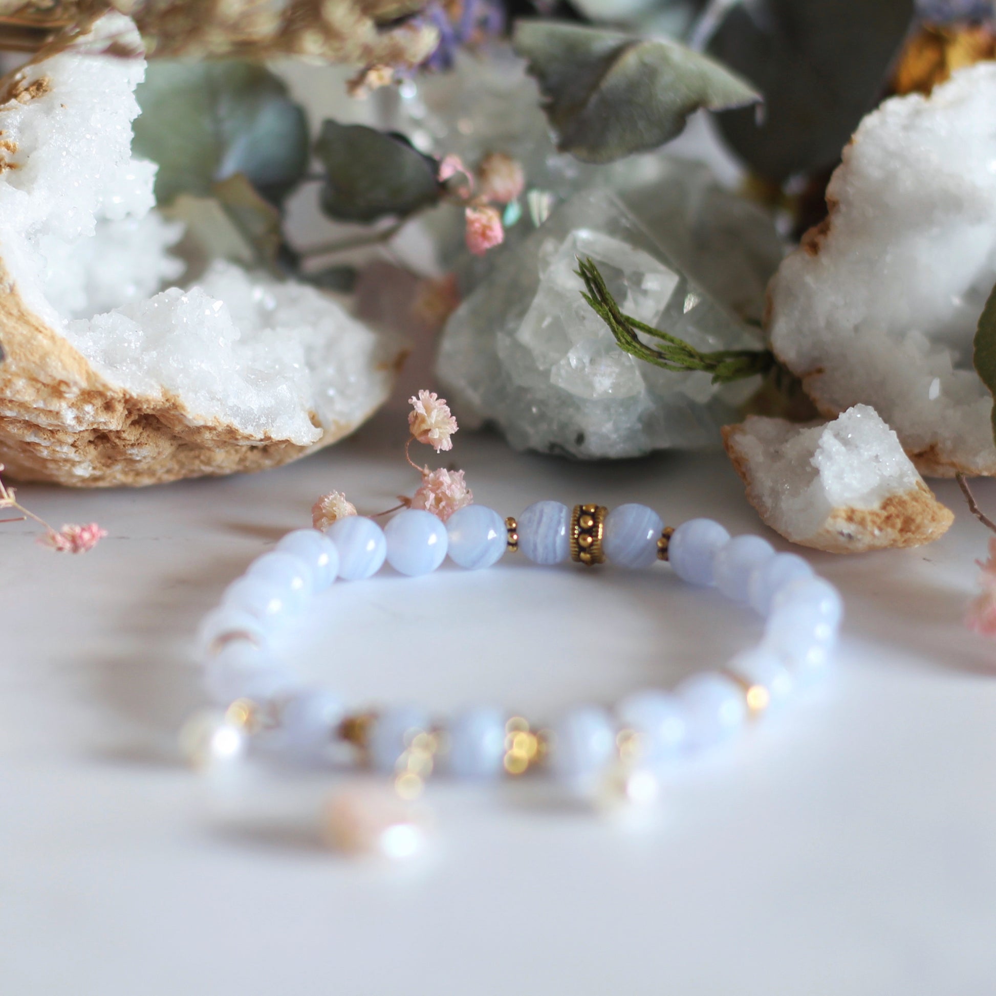 Blue Lace Agate helps with communication of emotions; soothes emotional turbulences; boosts security; encourages vulnerability while maintaining boundaries; promotes discernment of thoughts and words