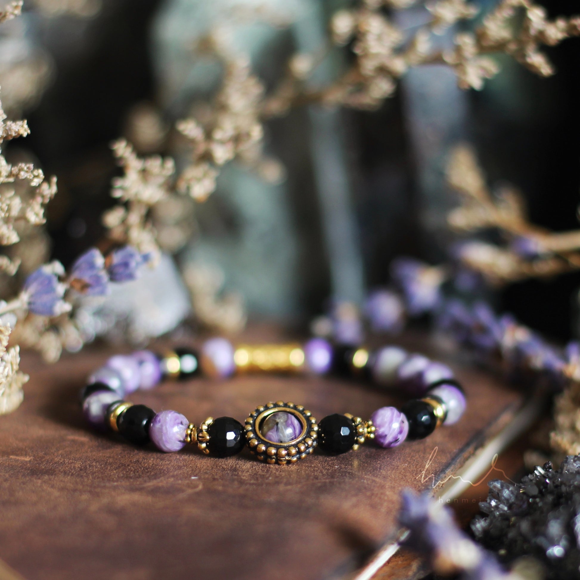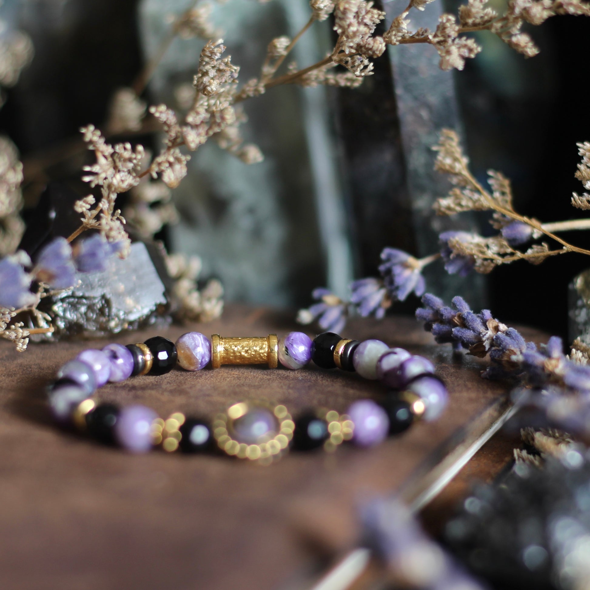 Elite is a combination of Charoite (6mm) with Black Onyx (round faceted, 6mm), topped with a gold-plated border core.