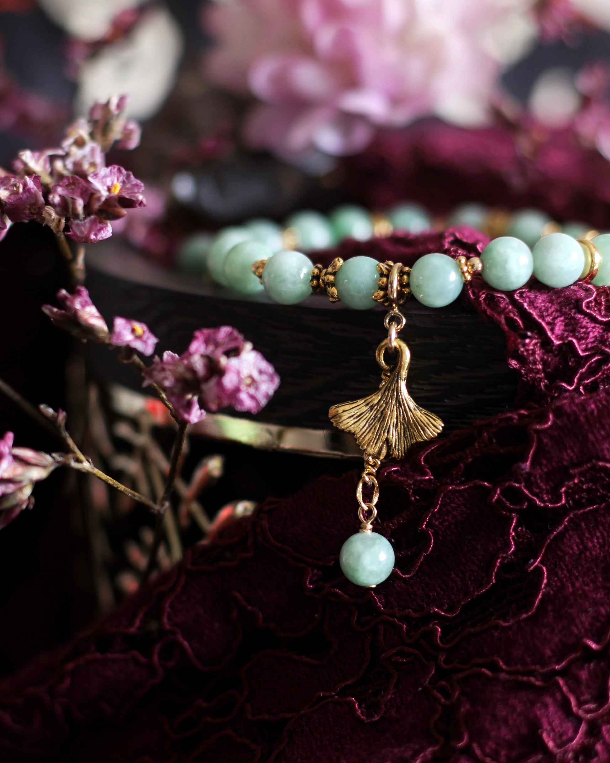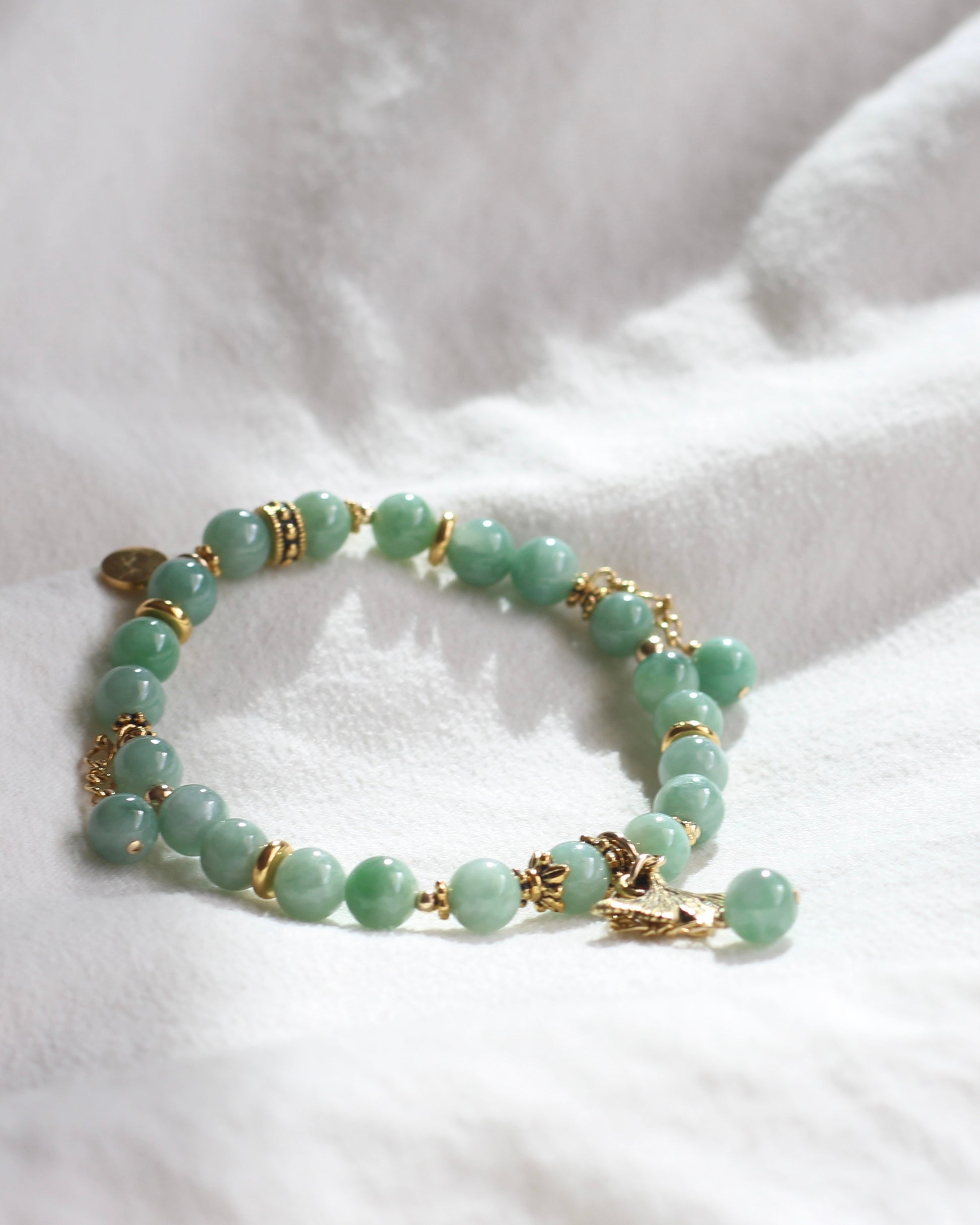Burma Jade (Type A, 6mm) with detachable gingko leaf and Jade charm (assembled with 14K gold-filled clasp and 14K gold-plated steel chain), two side Jade danglies, 22K gold-plated pewter embellishments.