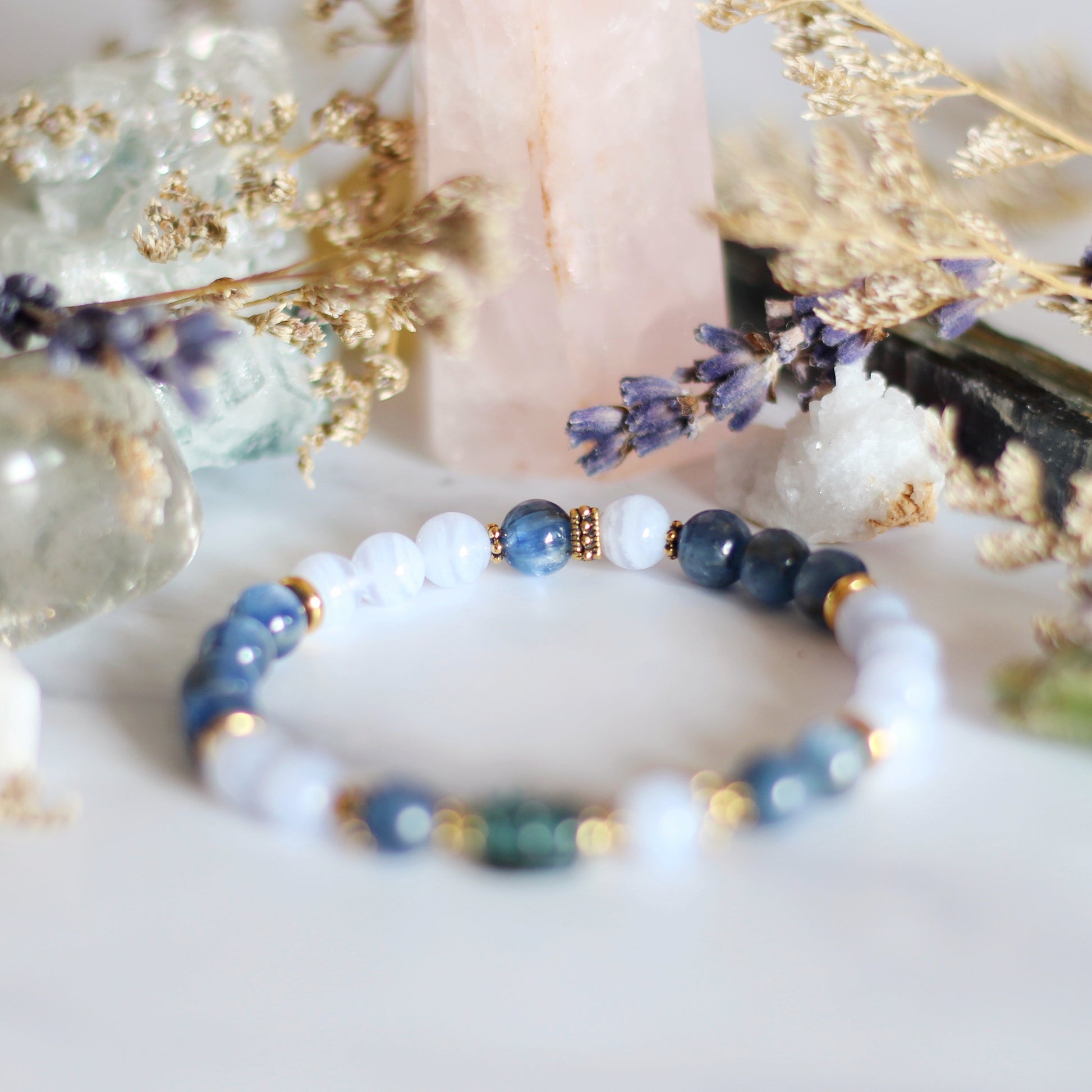 Blue Lace Agate helps with communication of emotions; soothes emotional turbulences; boosts security; encourages vulnerability while maintaining boundaries; promotes discernment of thoughts and words