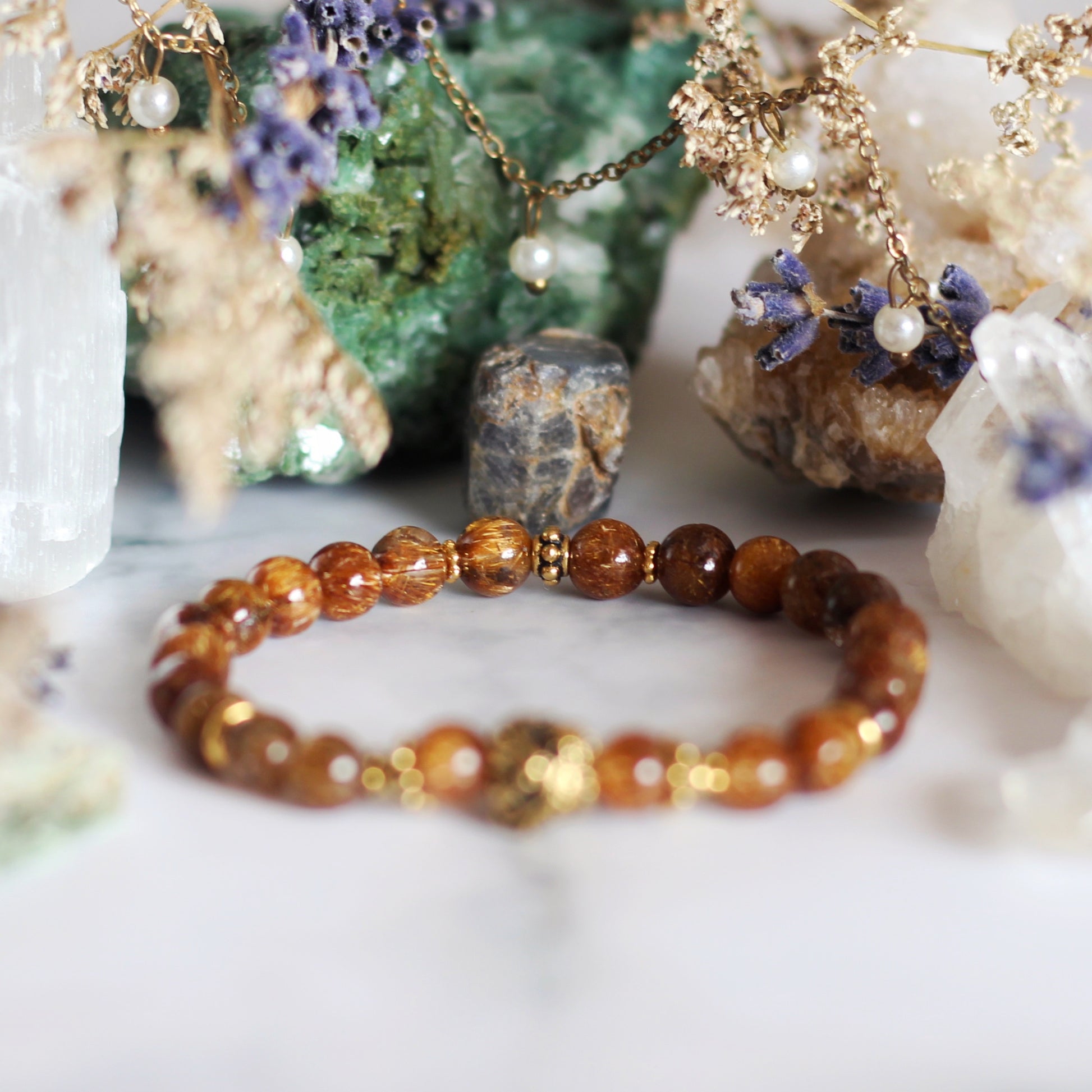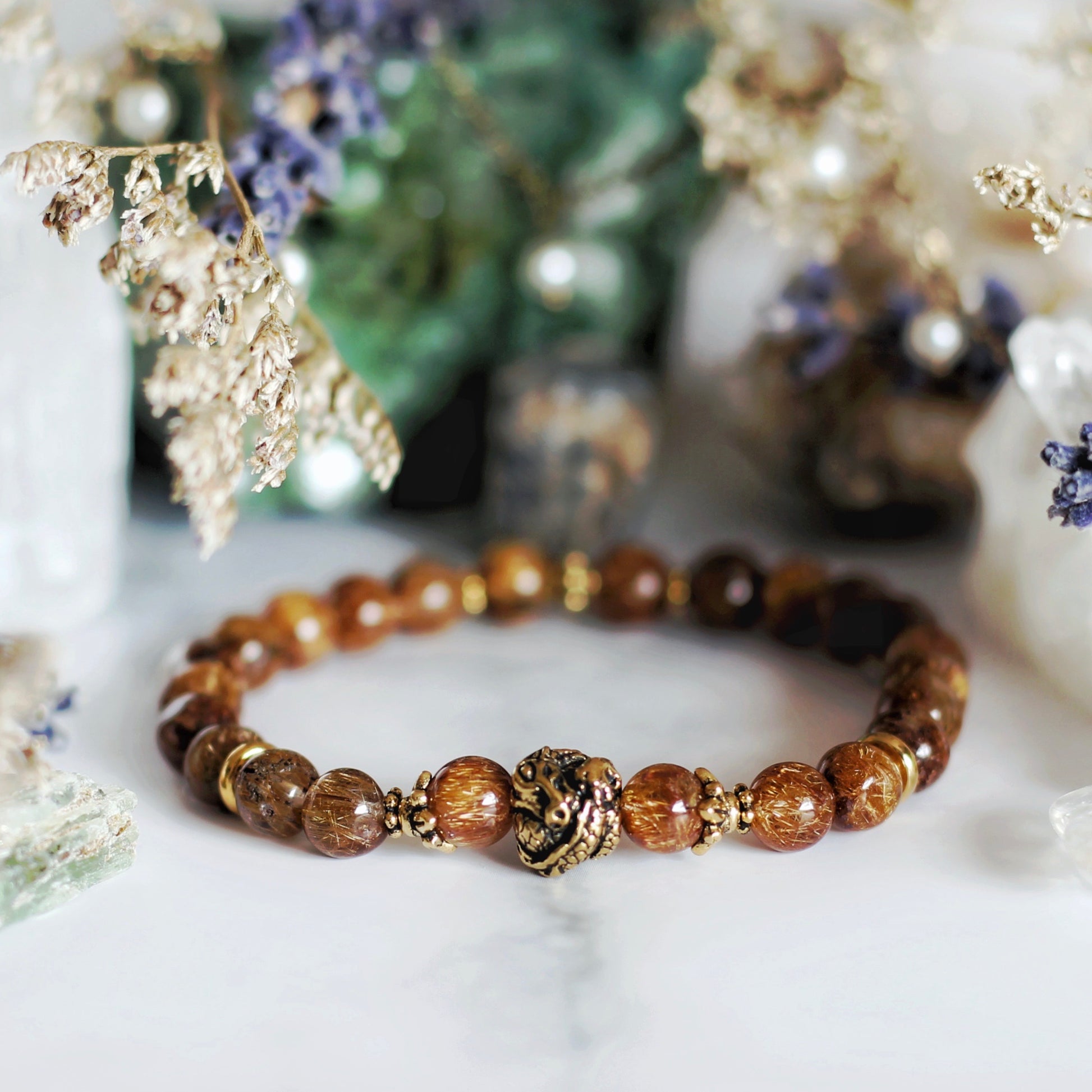 Red Rutilated Quartz (6mm) with gold-plated pewter dragon bead core (this form of rutile quartz is rare with full of rutiles in each bead)