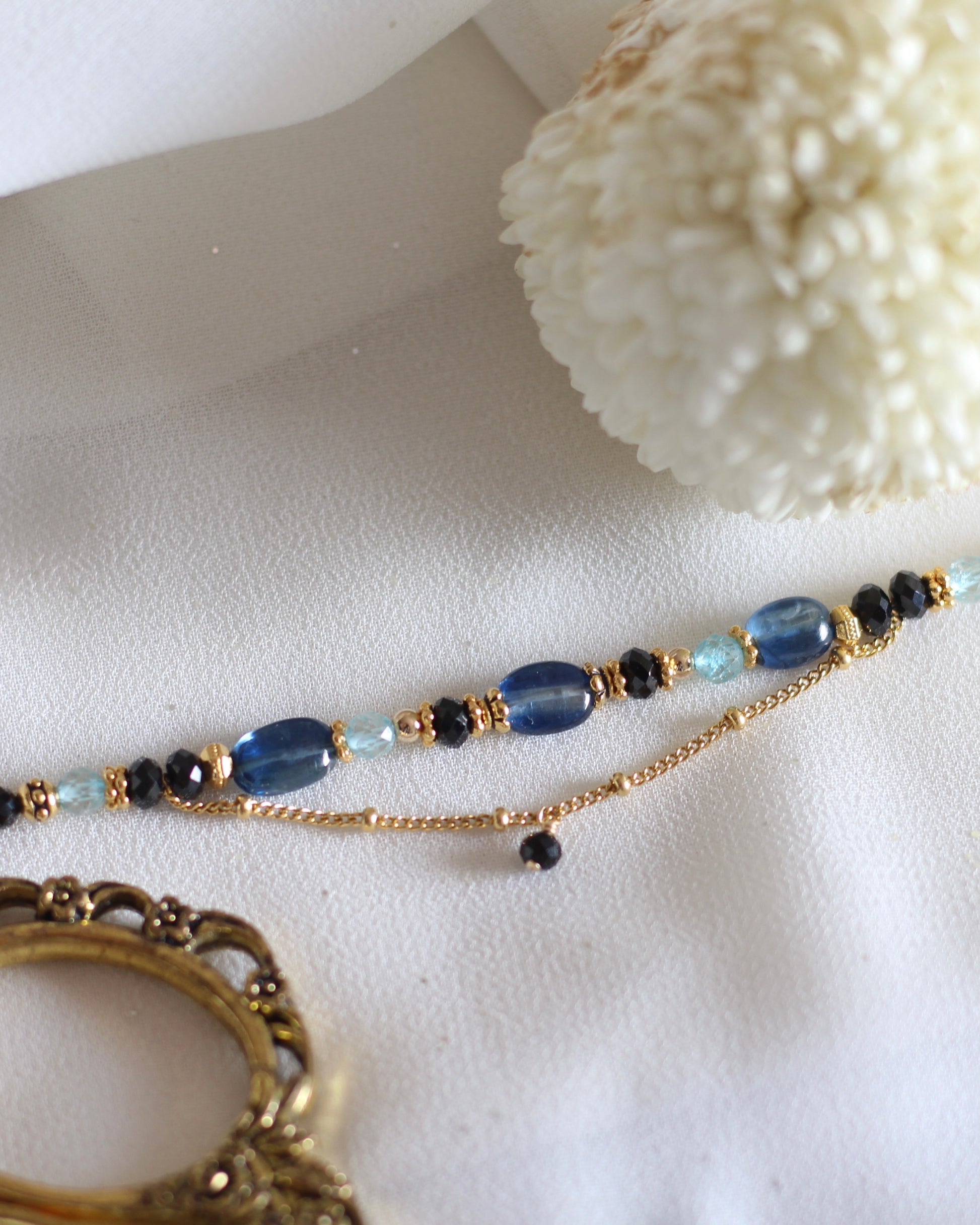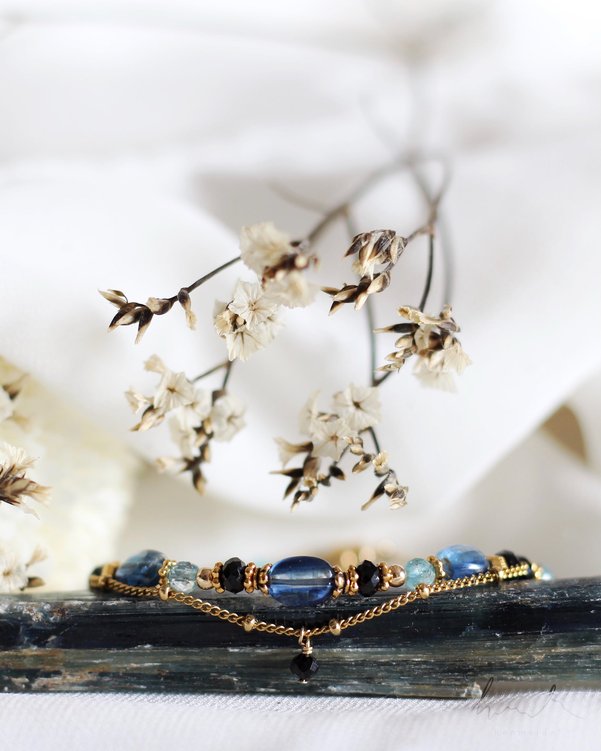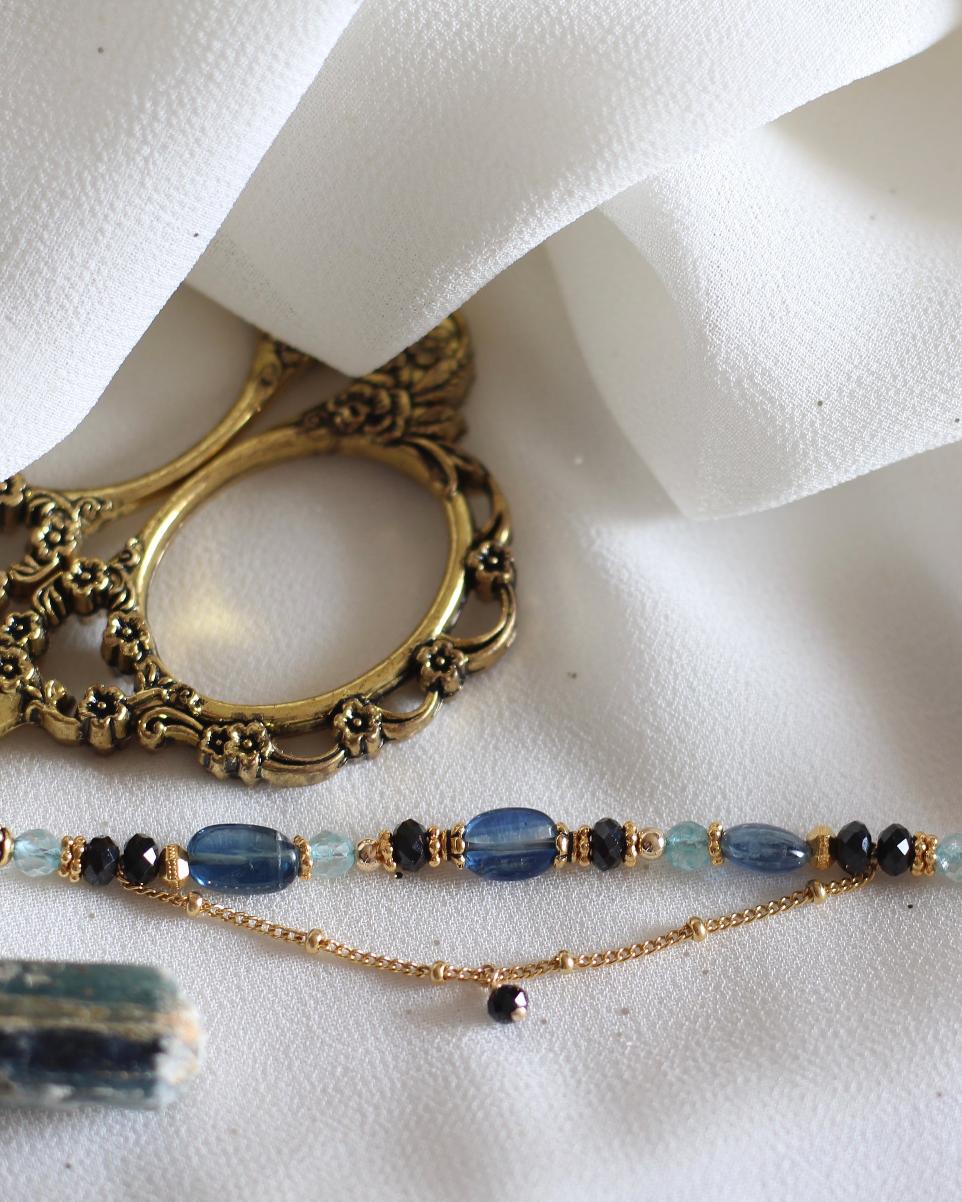 Kyanites (5-7mm), Blue Topaz faceted rounds (4mm) and faceted Black Spinel rondelles and rounds (3-4mm) with 14K gold-filled chain and magnetic clasp.