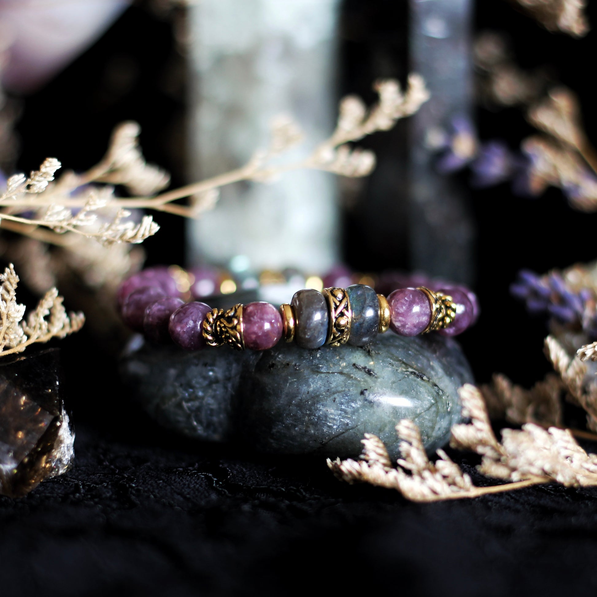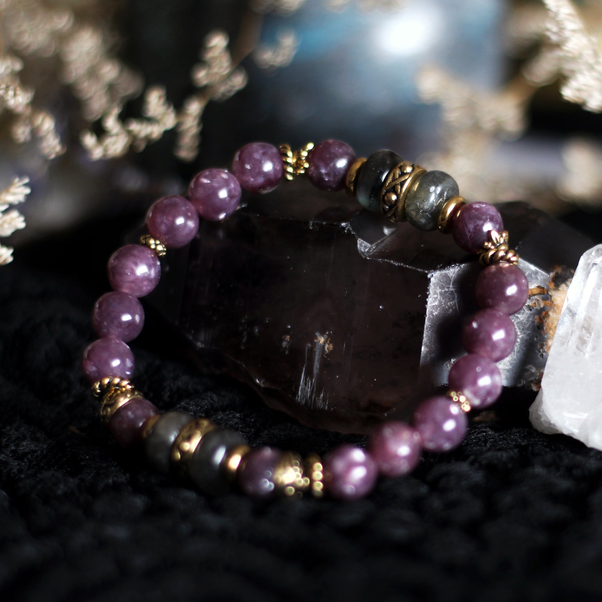 Valley is a Lepidolite (8mm) bracelet with duo-focal double Black Labradorite (rondelle, 9mm) cores.