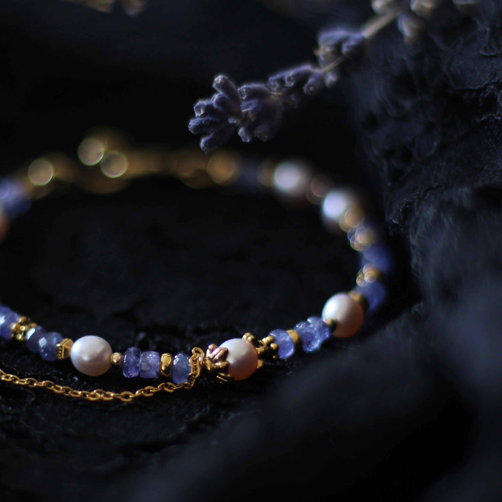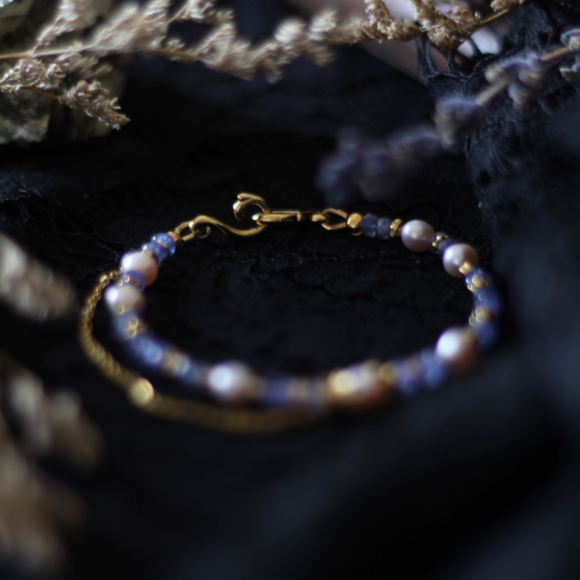 Velvet is a gold-plated hardware hook & eye clasp bracelet, made with Freshwater Pearls (pink hue, 5-6mm) with Tanzanite (rondelle, 3mm). Comes with a tiny side chain.